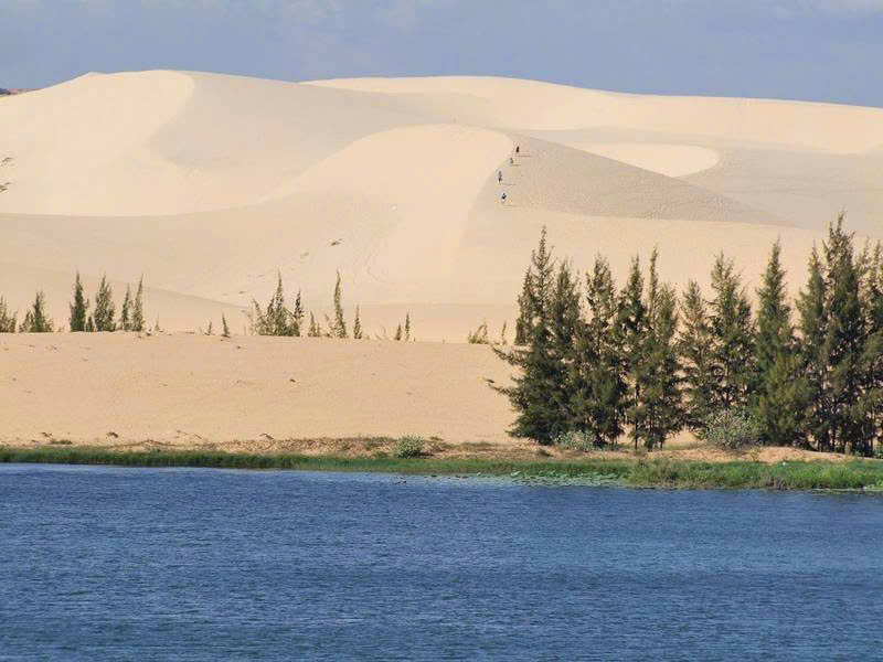 Nhiều du khách lựa chọn tham quan vào sáng sớm để kết hợp ngắm hồ nước tự nhiên nằm giữa đồi cát, tạo nên khung cảnh hiếm thấy ở vùng ven biển.