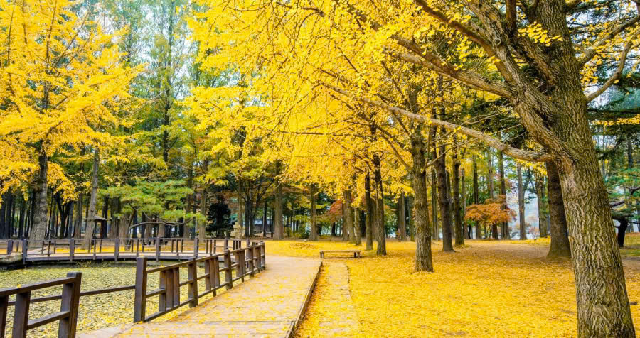 Mùa thu được xem là thời điểm đẹp nhất tại đảo Nami. Khi đó, những hàng cây ngân hạnh chuyển sang màu vàng rực rỡ, trong khi lá phong nhuộm đỏ nhiều góc đảo, tạo nên khung cảnh đặc trưng của mùa thu Hàn Quốc.