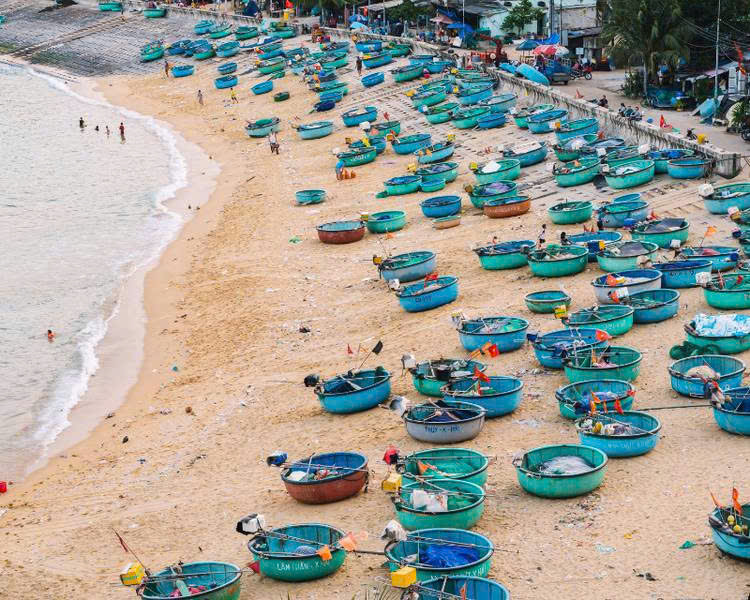 Làng chài ven biển Phú Yên với thuyền thúng và nhà ven biển