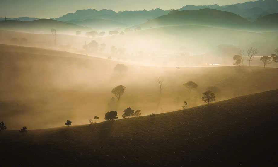 Sương sớm và ánh nắng nhẹ trên đồi chè Mộc Châu