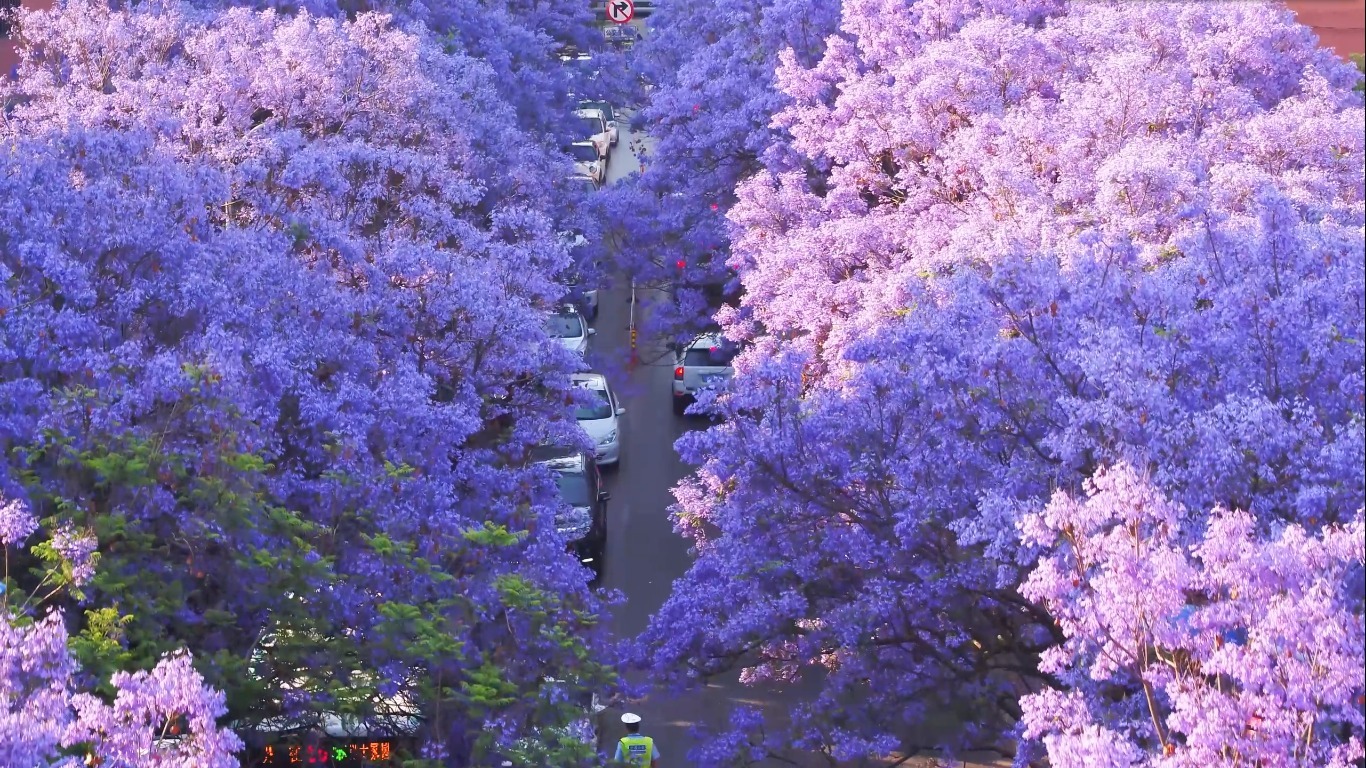 Hoa phượng tím (jacaranda) nở rực rỡ trên khắp các con phố lớn nhỏ của Côn Minh, đặc biệt nổi bật tại khu vực quanh Đại học Vân Nam. Những tán hoa bung nở tạo thành mái vòm tím biếc, rơi nhẹ trong gió, khiến bất cứ ai đi qua cũng phải dừng lại để ngắm nhìn và chụp ảnh. Đây cũng là thời điểm thành phố thu hút rất đông du khách và nhiếp ảnh gia.