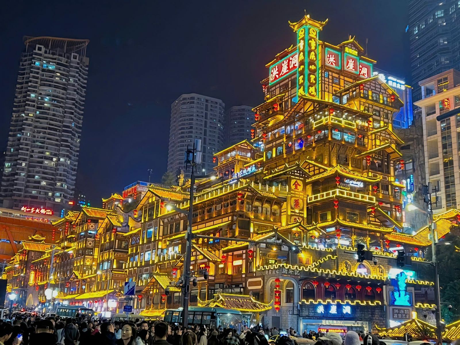Hồng Nhai Động là nơi thường xuất hiện trong hầu hết các hình ảnh về Trùng Khánh. Ban ngày, khu vực này không quá khác biệt, nhưng khi đèn lên, toàn bộ không gian trở nên nổi bật với ánh sáng vàng đặc trưng.