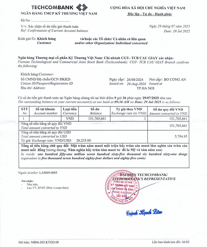 - Ví dụ: 2 người lớn + 1 trẻ em → xác nhận số dư nên có ít nhất 150 triệu đồng.